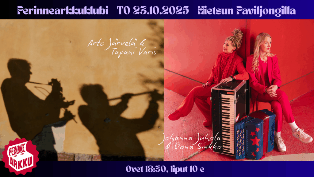 Perinnearkkuklubi: to 23.10. klo 19 Pelimanniduot Arto Järvelä & Tapani Varis sekä Johanna Juhola & Oona Sinkko "Konserttien aikana mahdollisuus ja tilaa myös tanssia!" 18.30 ovet 19.00 Arto Järvelä & Tapani Varis 20.00 Johanna Juhola & Oona...